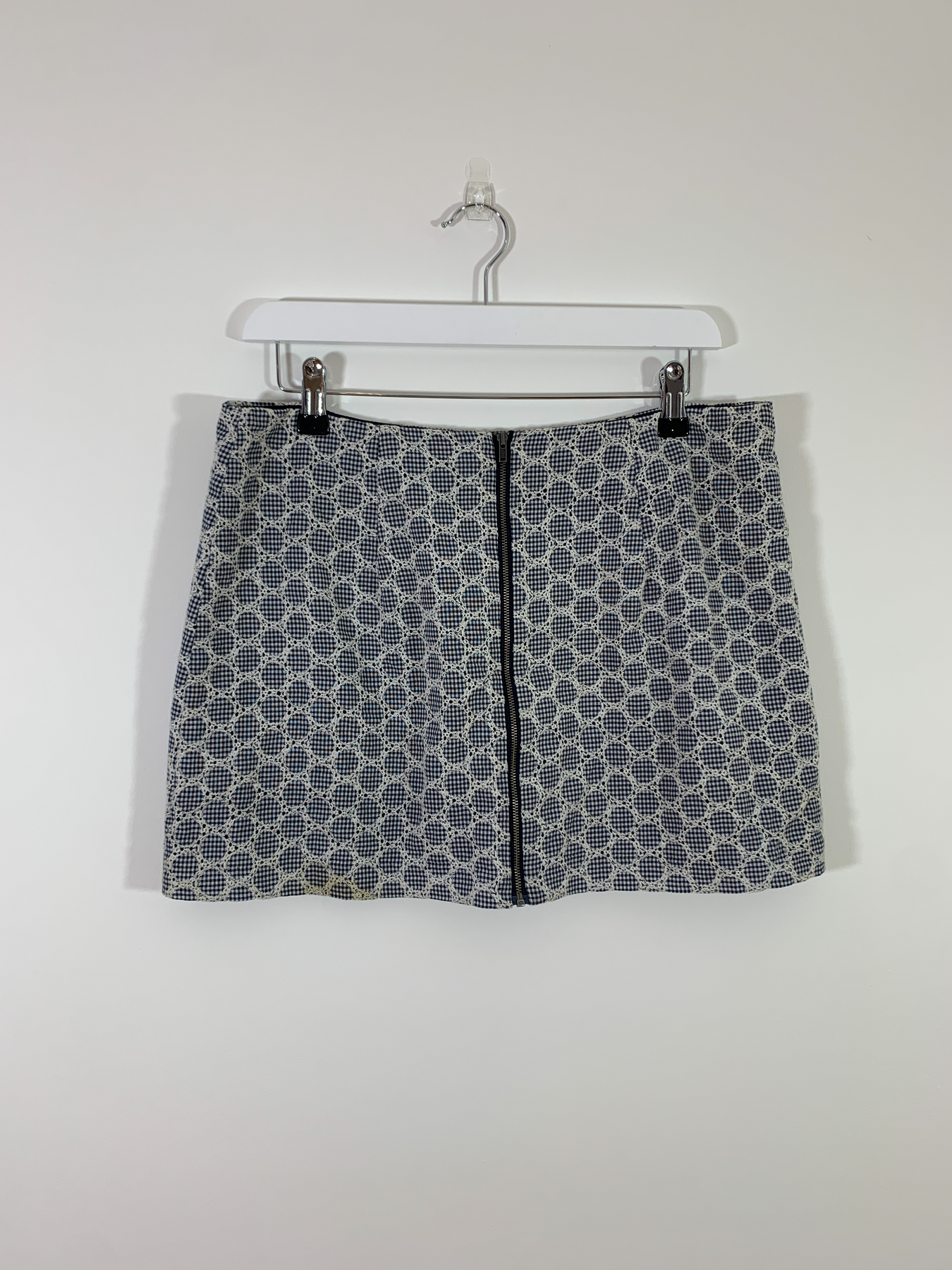 This pretty little skirt has a zip up the back and is a slight a-line fit. It still has it's tags on from Topshop (RRP £35). The print is blue gingham with white daisy flowers.